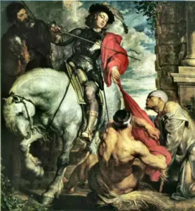 He was posted to Amiens in northern France where on a cold winter day he took pity on a beggar he saw shivering with cold outside the gates of the city, slicing his own cloak in two and giving half of it to the stranger to keep himself warm.