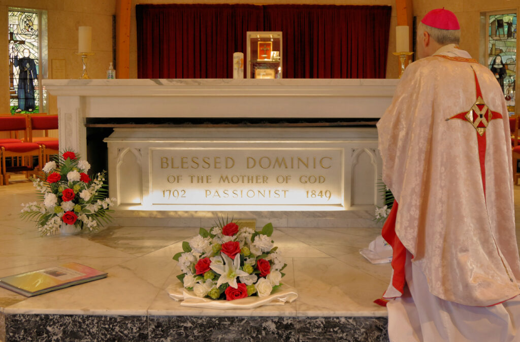 (Pictures of Bishop Davies preaching at the Mass for Venerable Elizabeth Prout in the Church of St Anne and Blessed Dominic Barberi, and praying at the tomb of Blessed Dominic, taken by Simon Caldwell, Sept. 13, 2025)