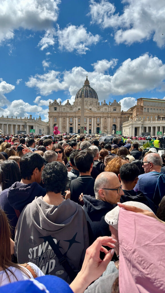 All the roads parallel to St Peter’s had been locked down in the early hours of the morning of Pope Francis’ funeral. One of these roads is where we are staying, the Borgo Pio. So alongside the thousands of people who had waited patiently to access the square our roads, usually filled with people at restaurants or the many religious shops, were empty. An eerie stillness next to the busyness of the moment. Once the funeral began, and from the outside of the square, you could hear the applause building. Love pouring out for this man who has meant so much to so many. The emotions are overwhelming, I watched with quiet tears watching the Cardinals in their guard of honour as Pope Francis left the Basilica of St Peter for the final time. It feels we are intruding in intimate moments of death whilst at the same time being so welcome.