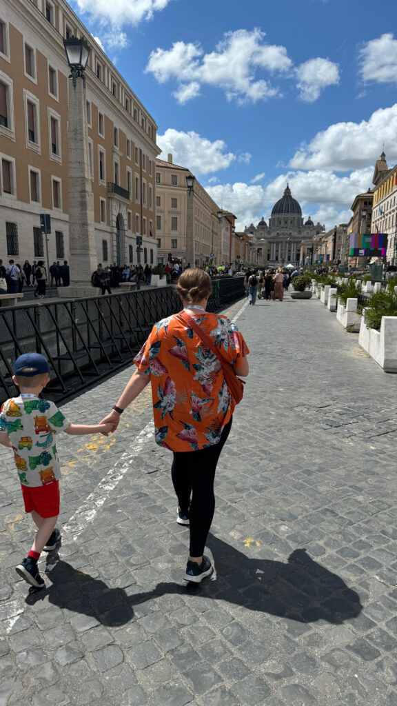 We moved outside the main thoroughfare to find space along the final procession. Lines of security begin to stand along the route. Our boy Michael, 5, was able to sit on a barrier at the edge of the road. We follow the progress of the funeral online and wait for that time when we will see Pope Francis one last time. We see black cars beginning to stream through the route as foreign leaders leave the funeral. But it’s the mini bus of clergy, vehicles full of cardinals, the wooden platform that was used to carry the body of Pope Francis out of the Basilica that pass us on their way to Mary Major that signals that the Holy Father is near. We begin to cheer and clap as we see the white of the Pope mobile – his final journey. Our final goodbye.